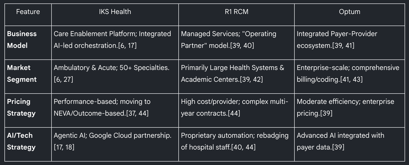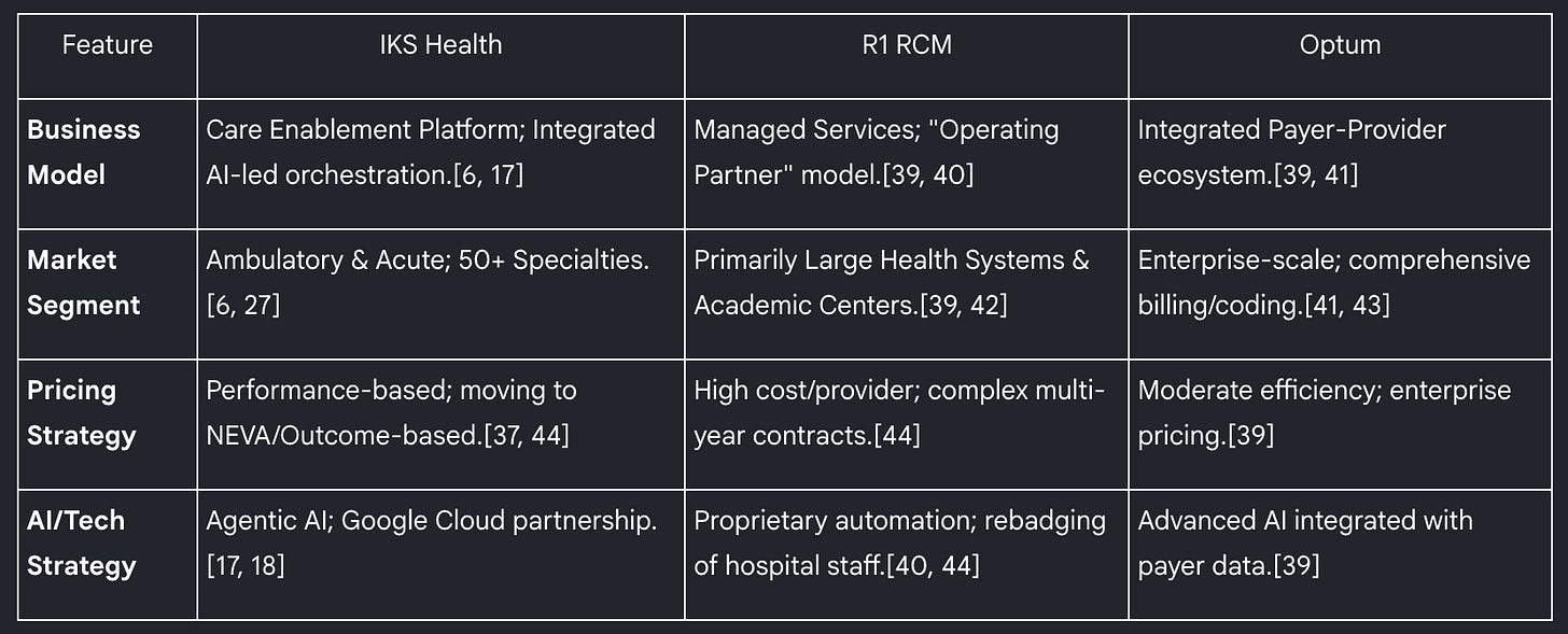 IKS Health operates in a highly competitive market populated by global healthcare giants (but IKS health is winning marketshare from last 5 years given their growth rate), specialized RCM firms, and emerging AI pure-players. The company’s primary competitors include R1 RCM, Optum (a subsidiary of UnitedHealth Group), and AGS Health.